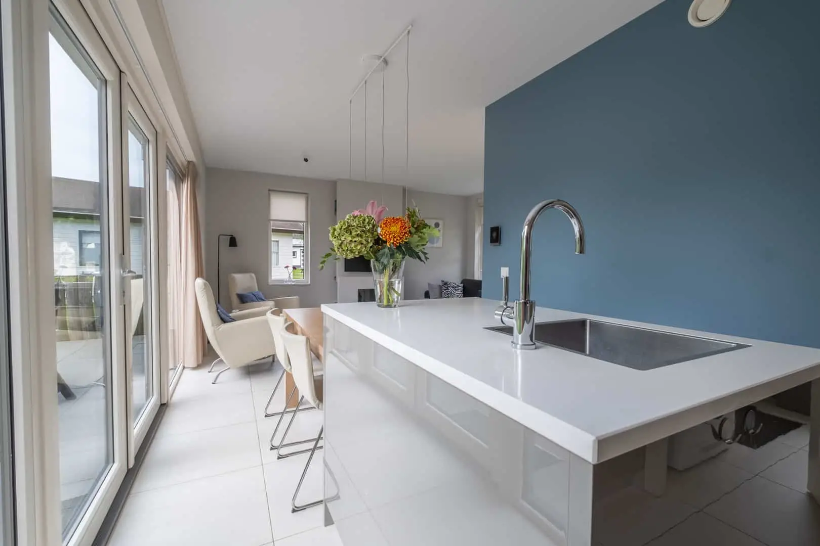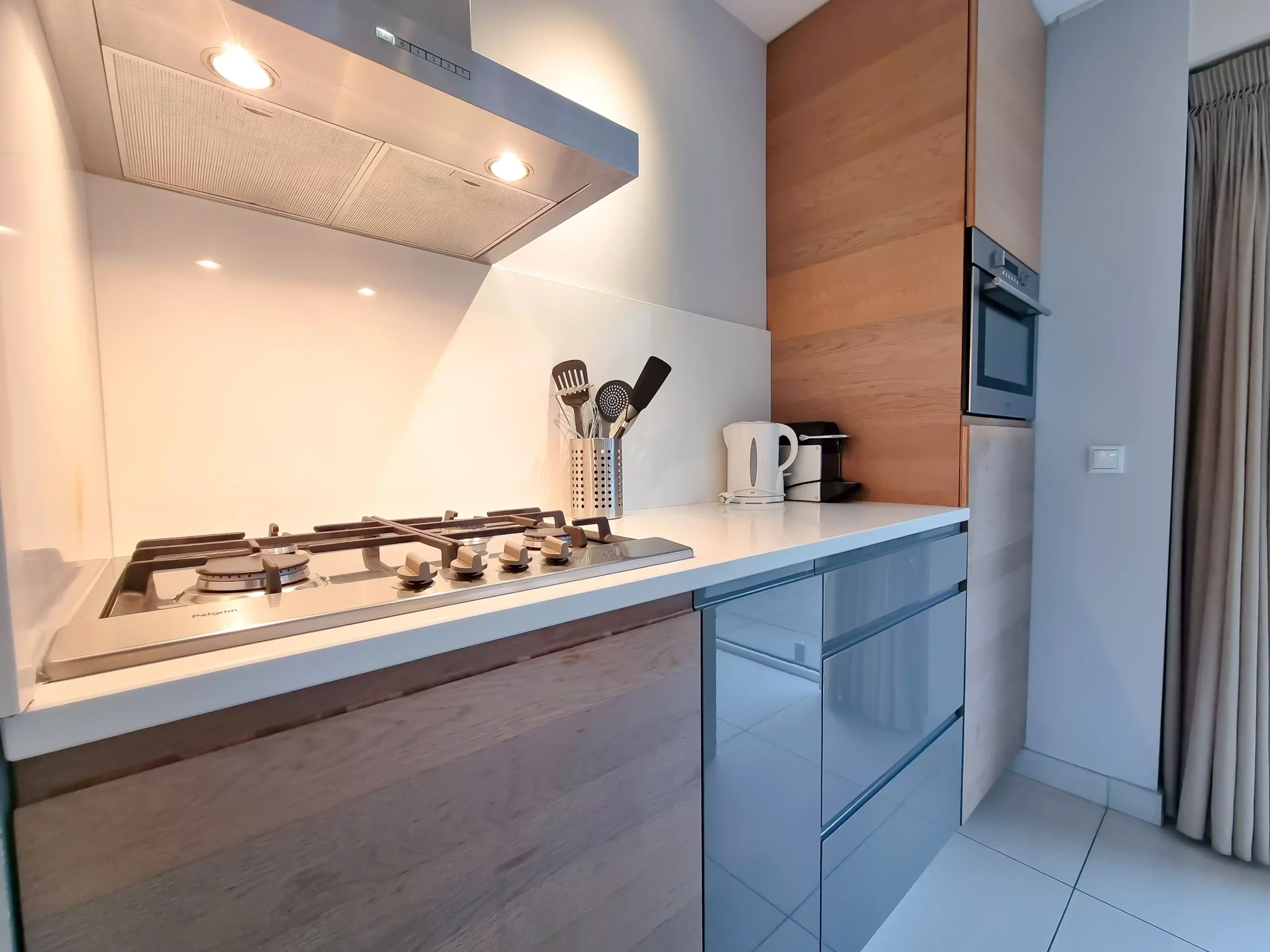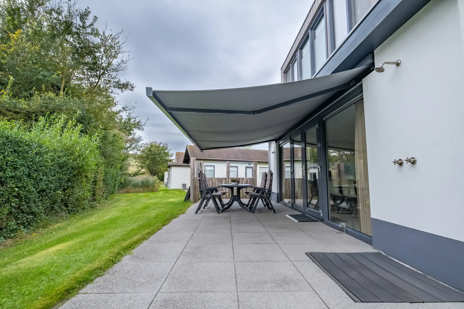 uitgeruste open keuken en openslaande deuren naar een privé-terras met elektrisch zonnescherm en uitzicht op de duinen. Buiten is een douche om het zand van u af te spoelen.