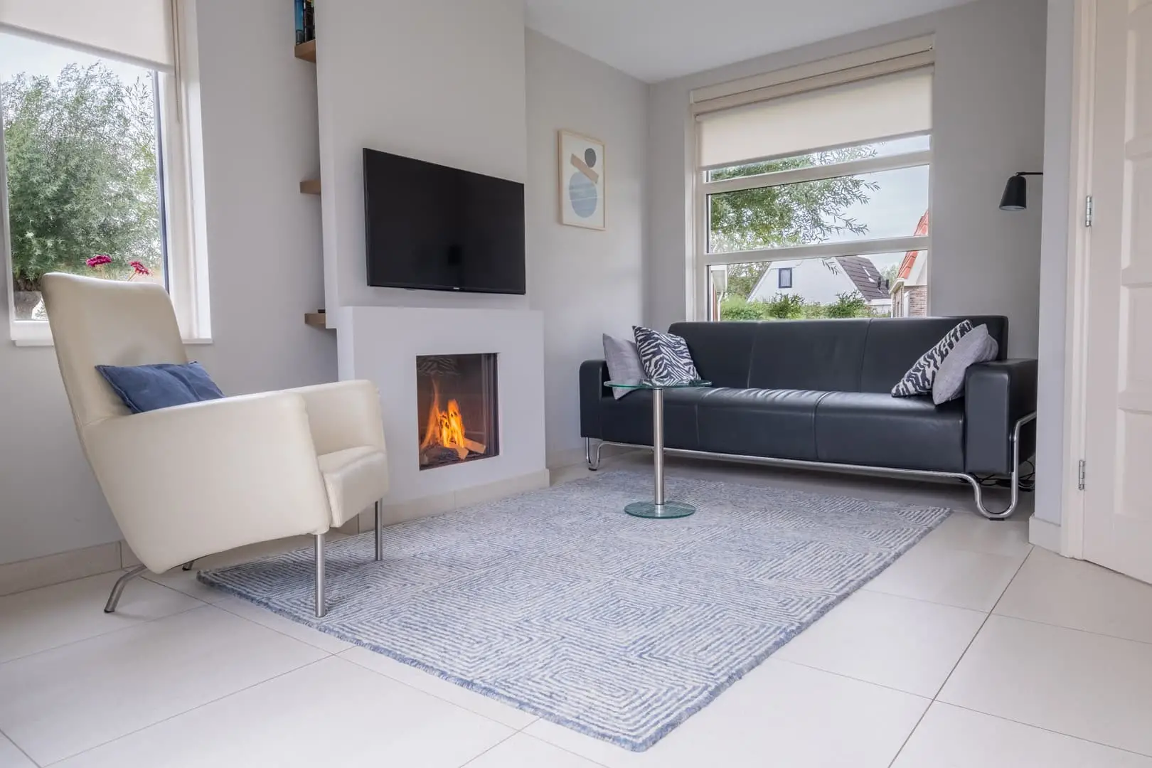 De woning is comfortabel ingericht met een zithoek met sfeerhaard, een volledig